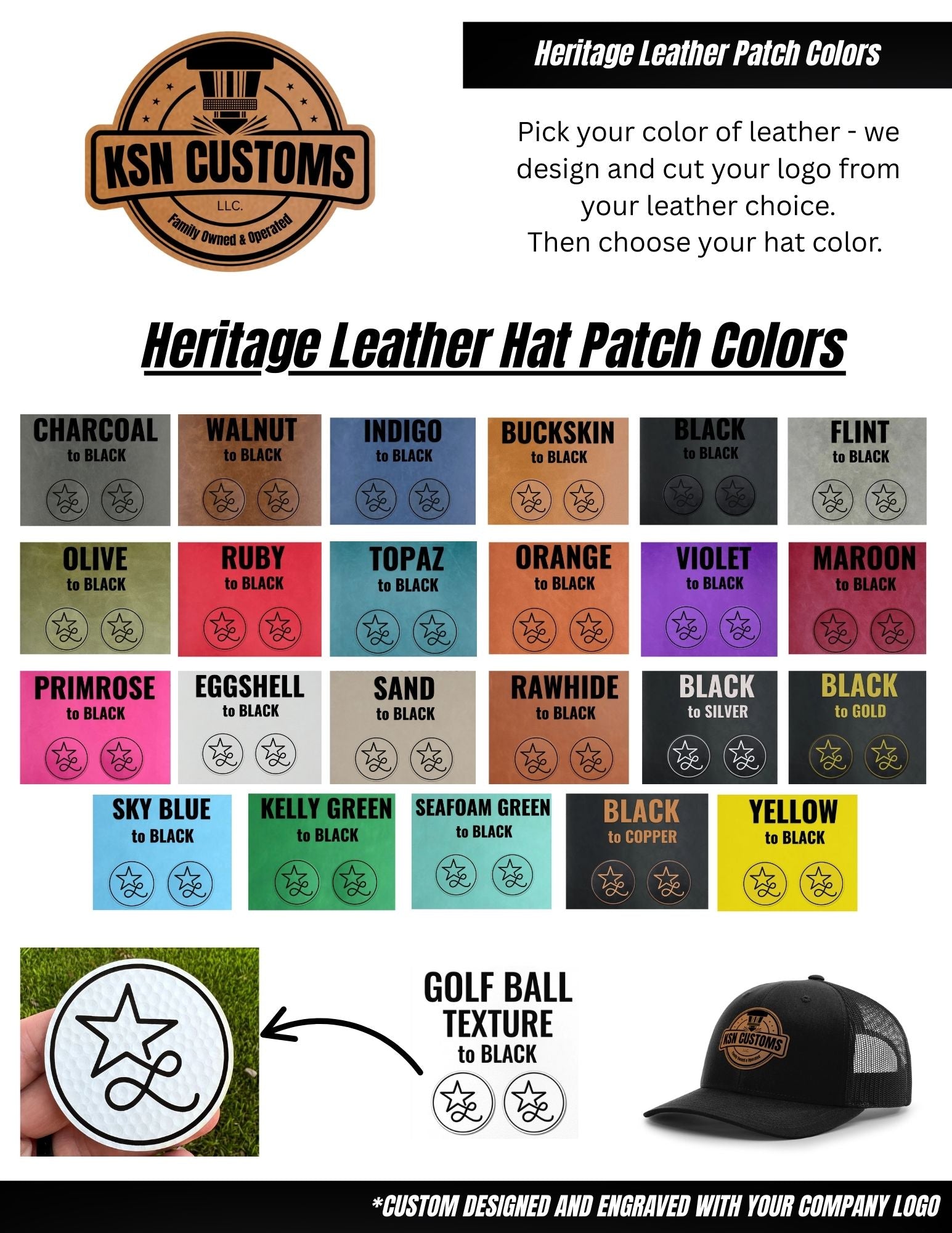 Have your Logo engraved onto your color choice of leather, as well as your choice of hat.
